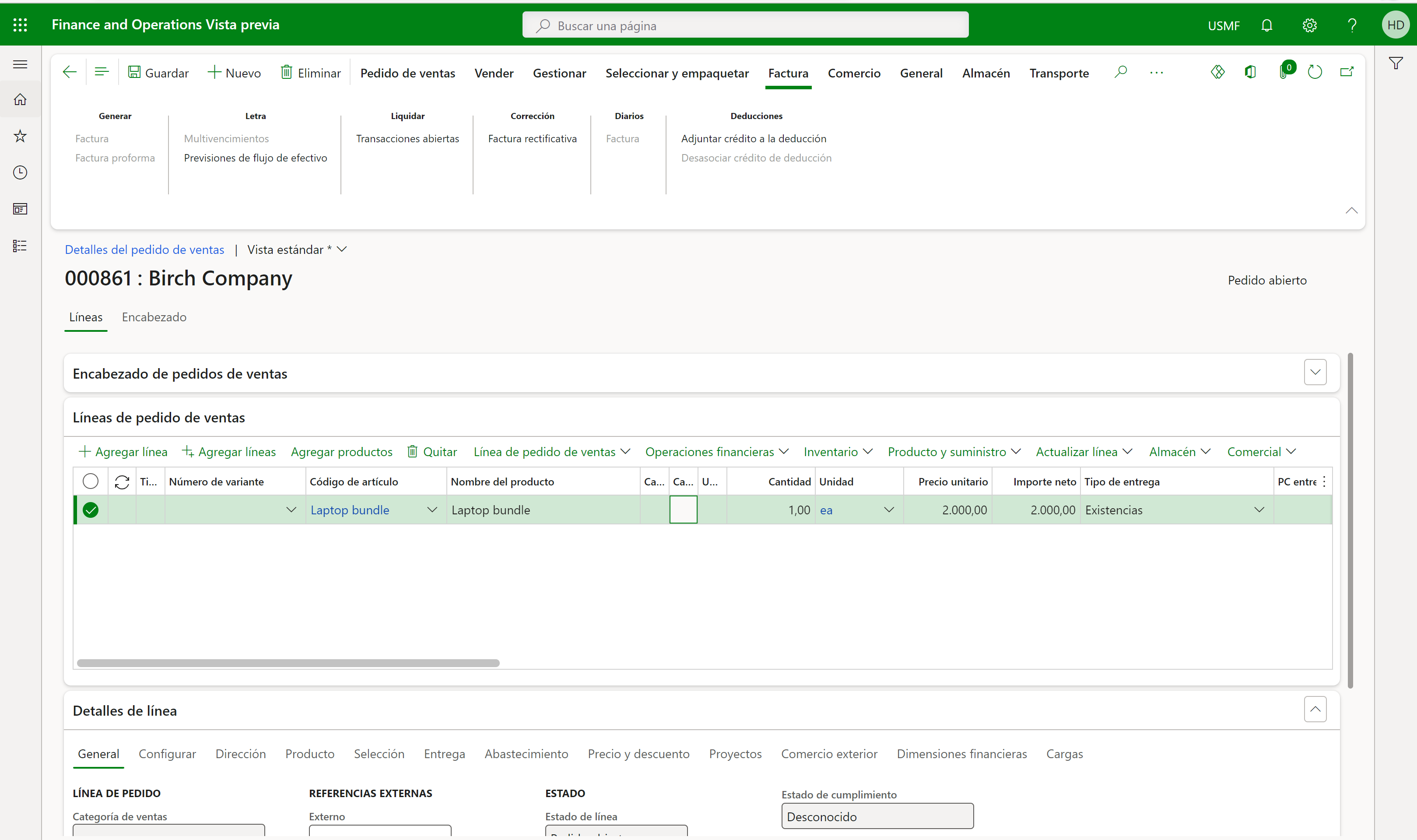 Sin embargo nuestro producto agrupador no tiene precio alguno y lo pondremos en el propio pedido (en este caso 2.000$)
