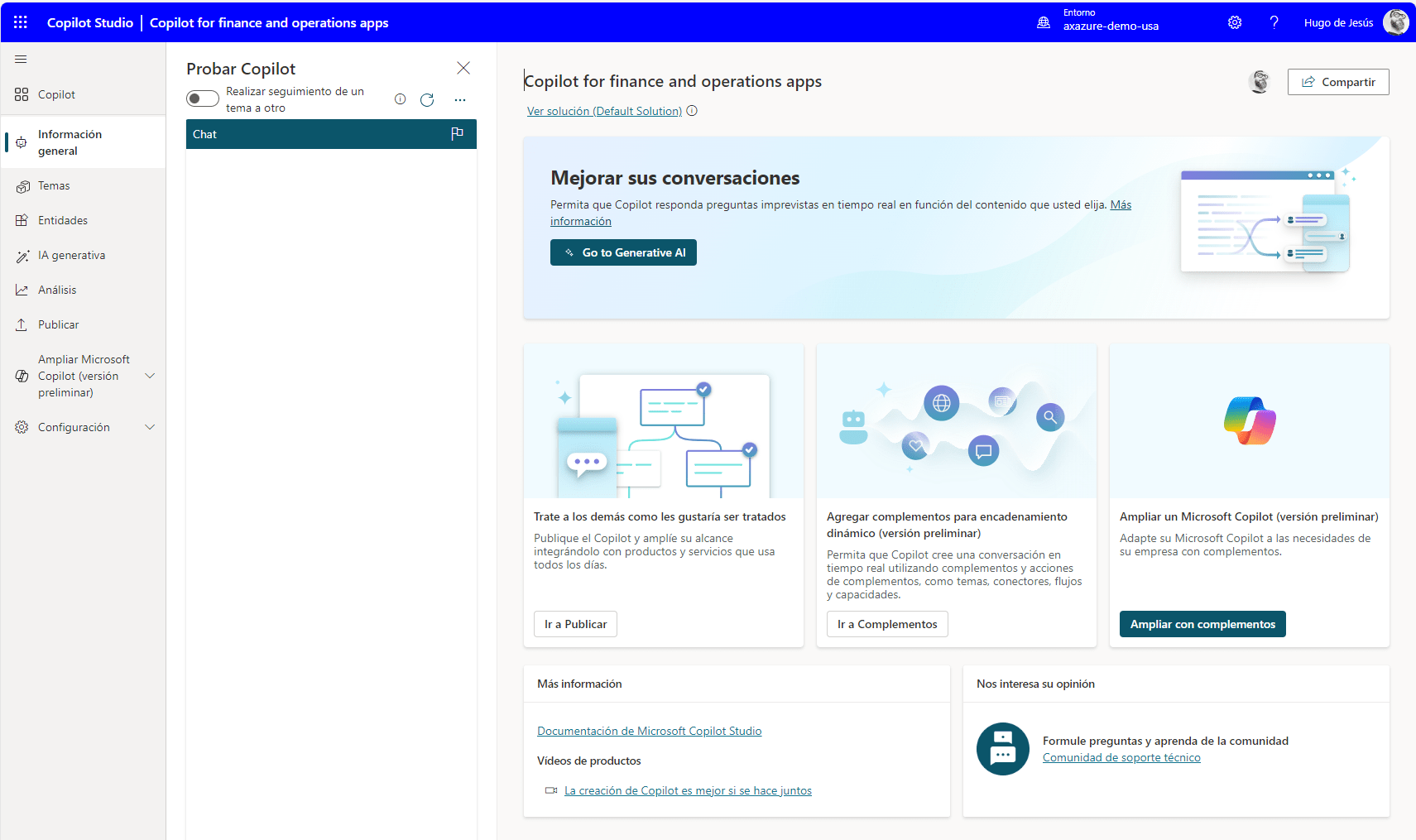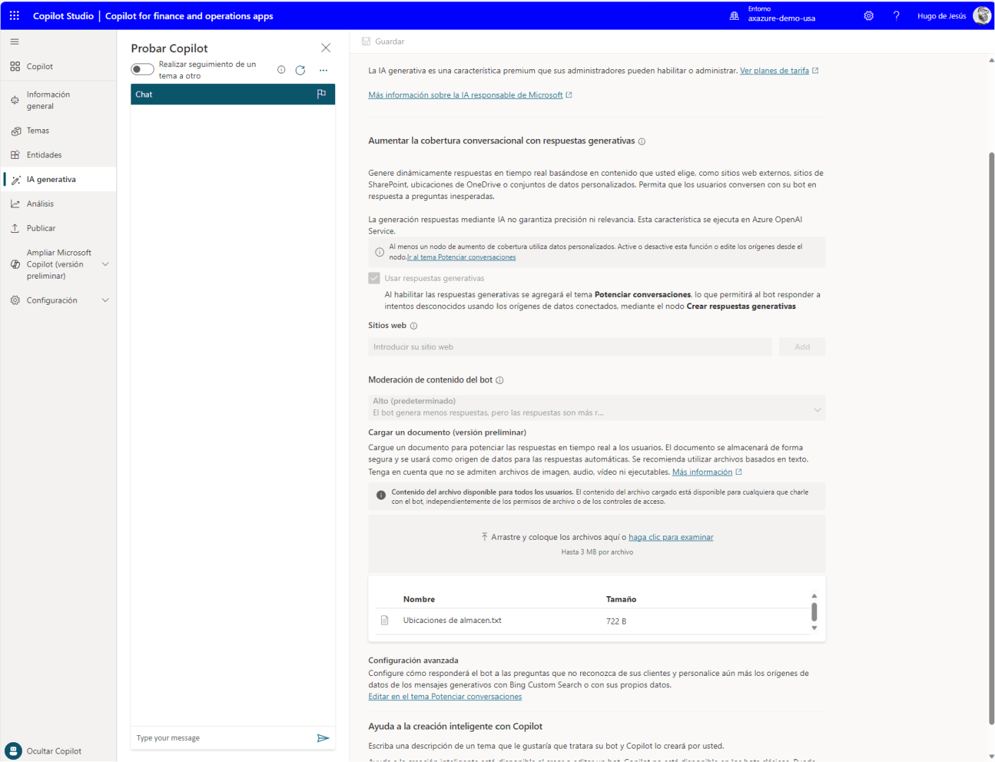 Y con esto tenemos nuestro Copilot que responde tanto preguntas sobre funcionamiento estándar como preguntas sobre el disponible de FO. Quedaría publicarlo en Teams y usarlo desde ahí.