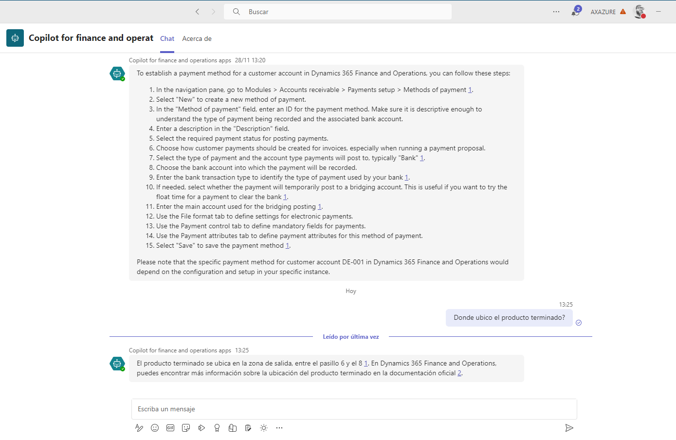 La funcionalidad que nos ofrece es la de, mediante lenguaje natural, resolver dudas sobre el uso de FO que obtiene del sitio de Learn (https://learn.microsoft.com/en-us/dynamics365) de Dynamics 365: