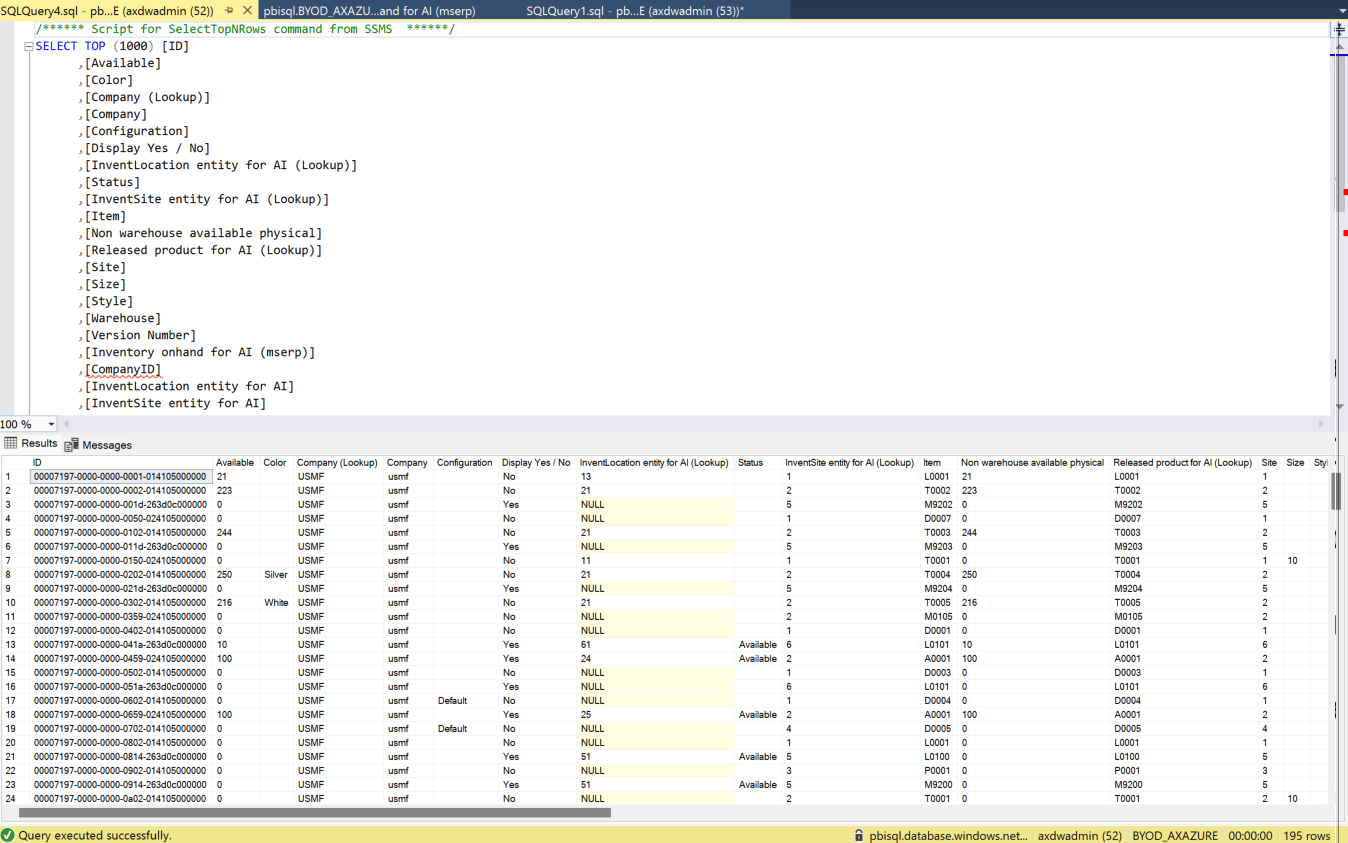 Para nuestro ejemplo seleccione la entidad de disponible (inventory on hand) a la que tuve que hacer algunos cambios para que no diera errores, por ejemplo, no se permite el uso de caracteres especiales excepto «-» en los campos de clave por lo que tuve que cambiar el campo clave. Tampoco se admiten campos con espacios en blanco y para añadirlos hay que hacerlo mediante Script, así que opté por simplificar los nombres. Pero finalmente, obtuve una entidad que se actualiza desde dataverse (o desde FO si se prefiere) con una estructura valida: