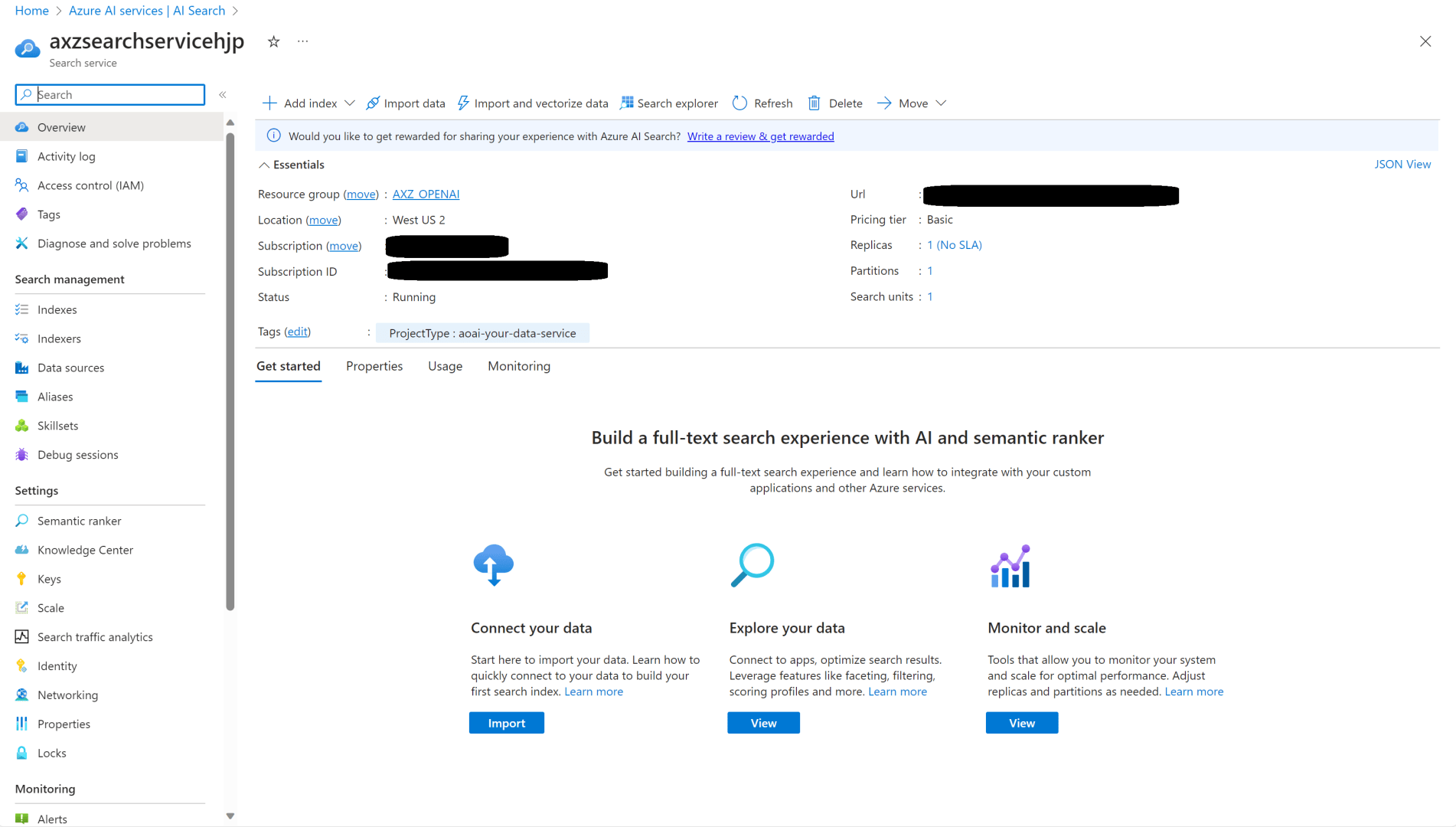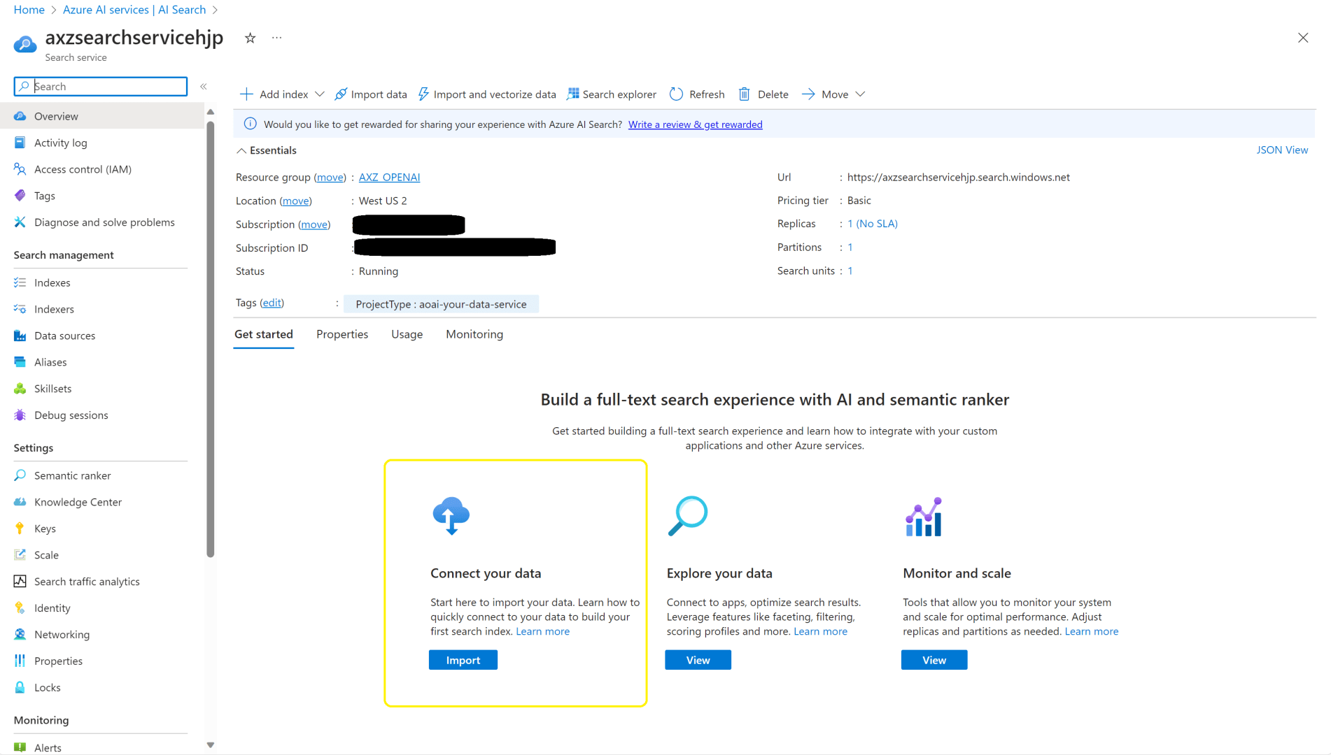 Lo siguiente es crear un servicio de AI Search con nuestro datos. Es importante recalcar que no funciona con el modelo Free, hay que ir al menos al básico con su coste correspondiente.
