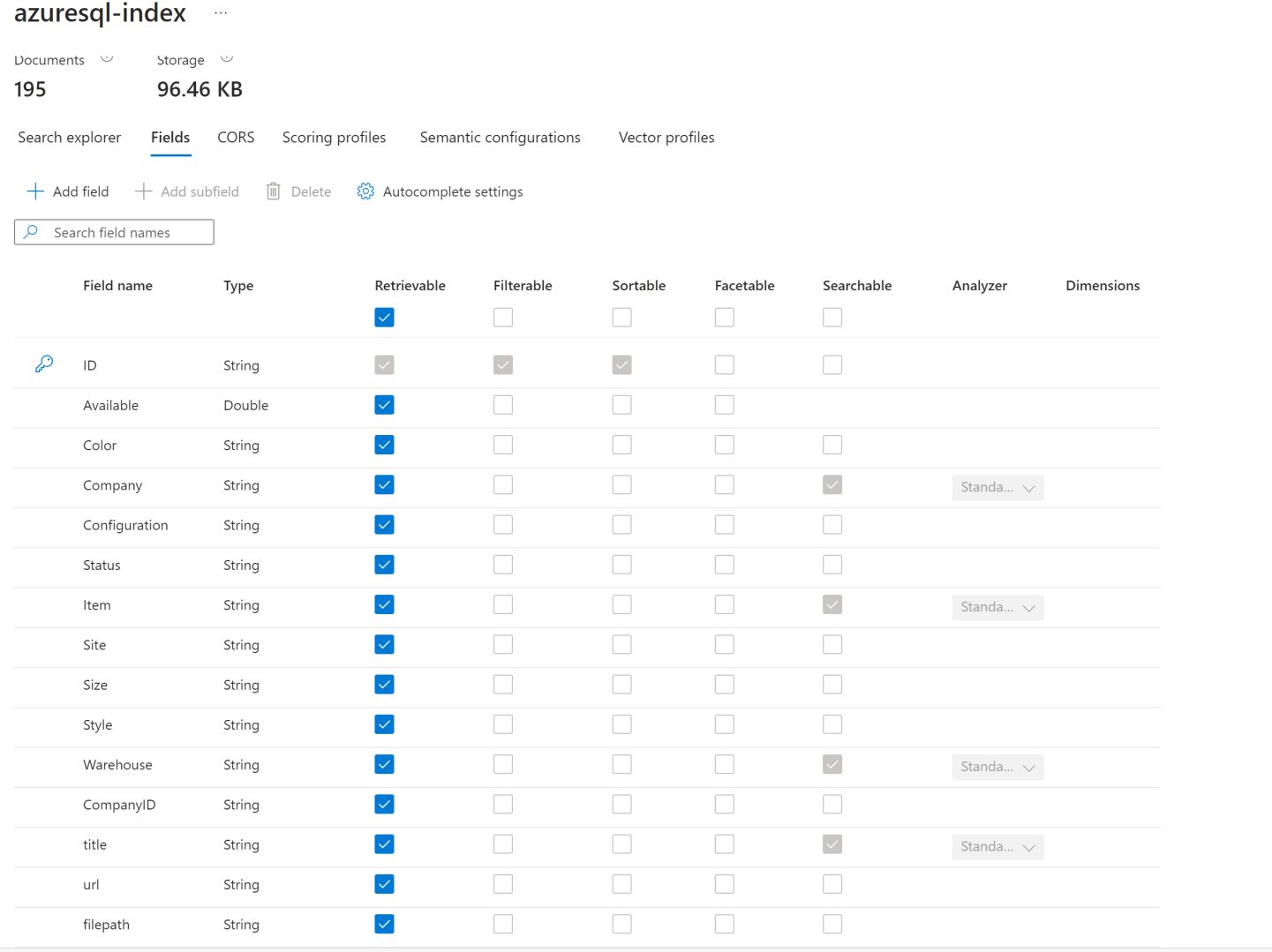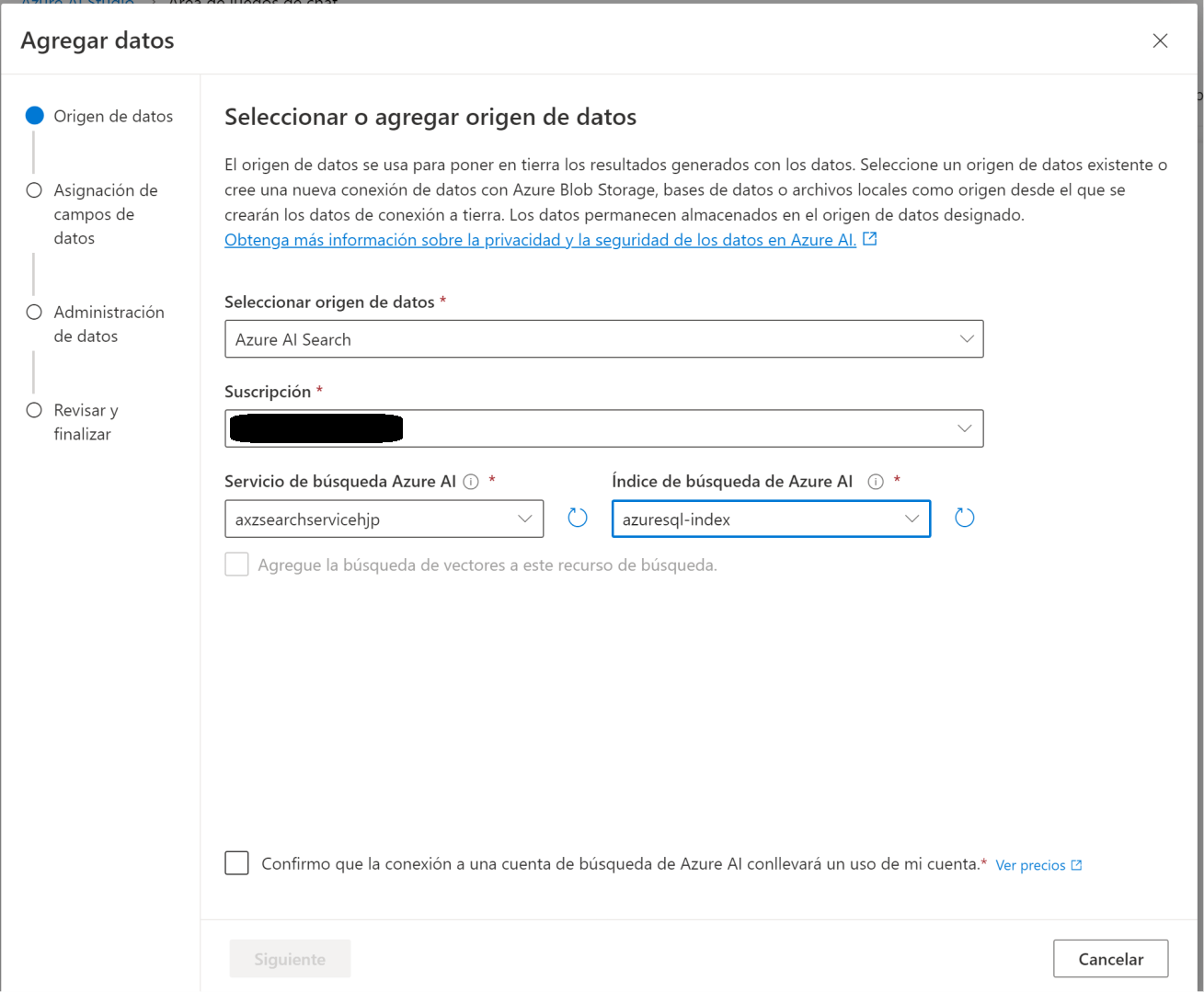 Luego añadí el origen de datos de nuestra BBDD de AZURE SQL y procedí a crear el índice mediante la opción de Importar: