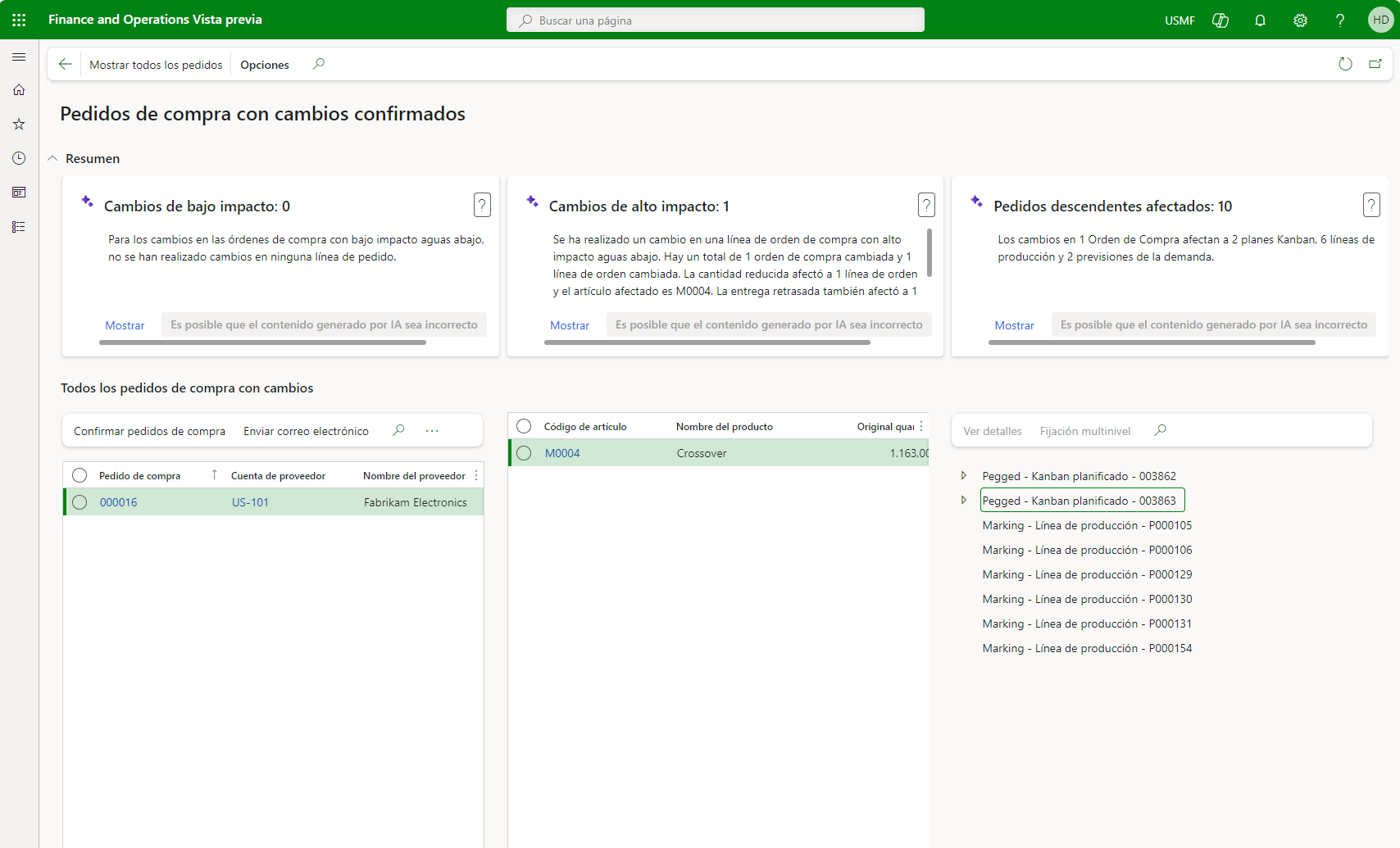 La siguiente funcionalidad si que utiliza algo mas los datos existentes, se ha creado un nuevo Workspace denominado «Pedido de compras con cambios confirmados» y en él nos muestra el retraso en los pedidos de compra y como afecta al resto de la cadena de suministro, como añadido nos lo explica en lenguaje natural: