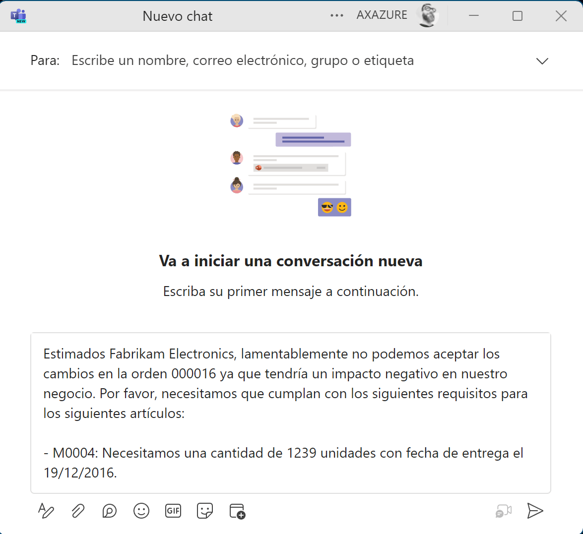 Además de poder navegar a los pedidos afectados podemos enviar automáticamente un mail o un mensaje de Teams al proveedor escrito también por la IA: