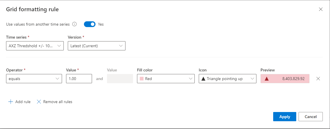 Por ejemplo, si hemos creado una serie temporal que nos indique un % de desviación, podemos añadir el condicional para que en base a este resultado nos muestre el formato que elijamos, para ello, en «Añadir datos» configuramos la serie que queremos como origen y su formato temporal: