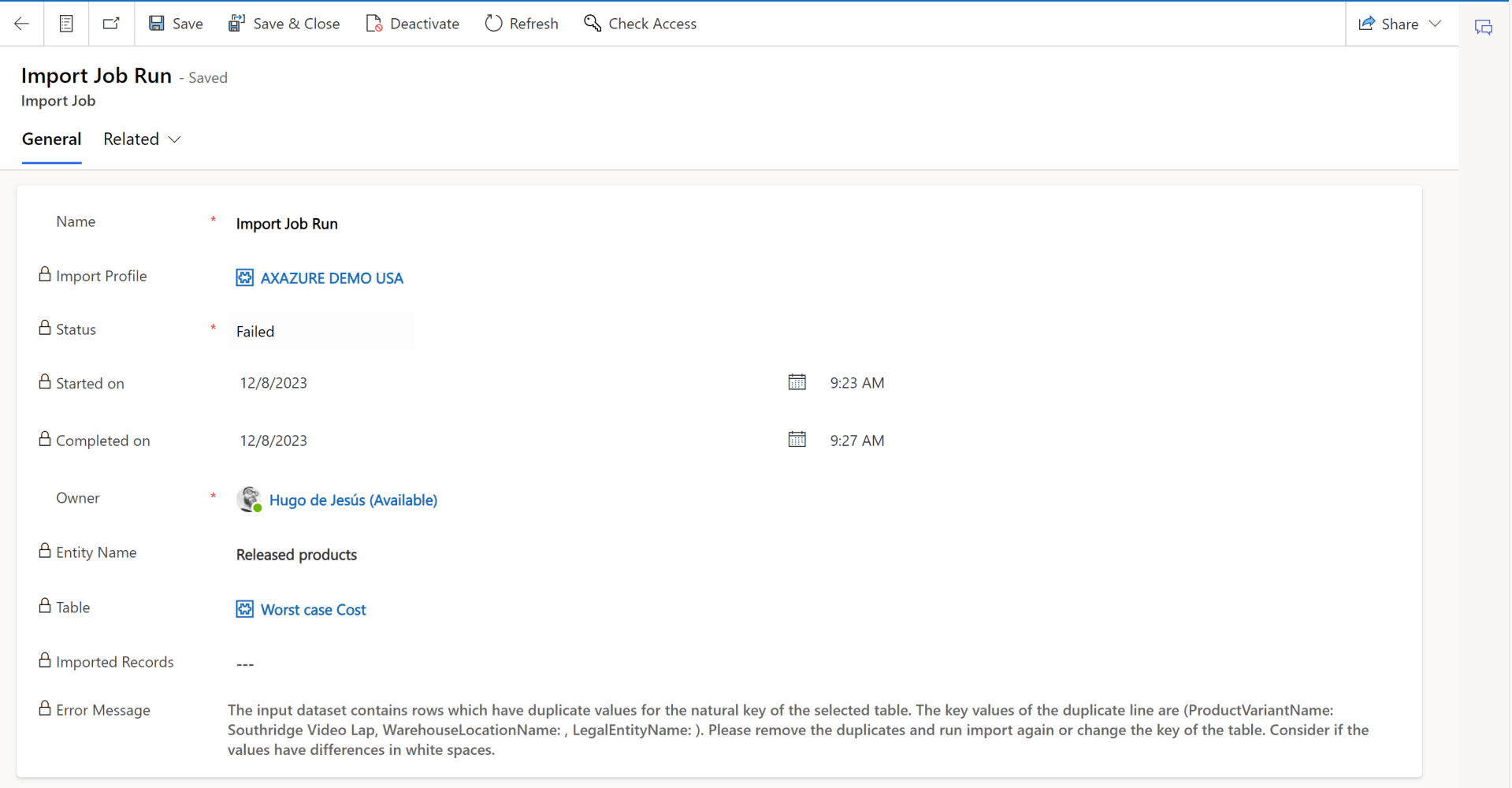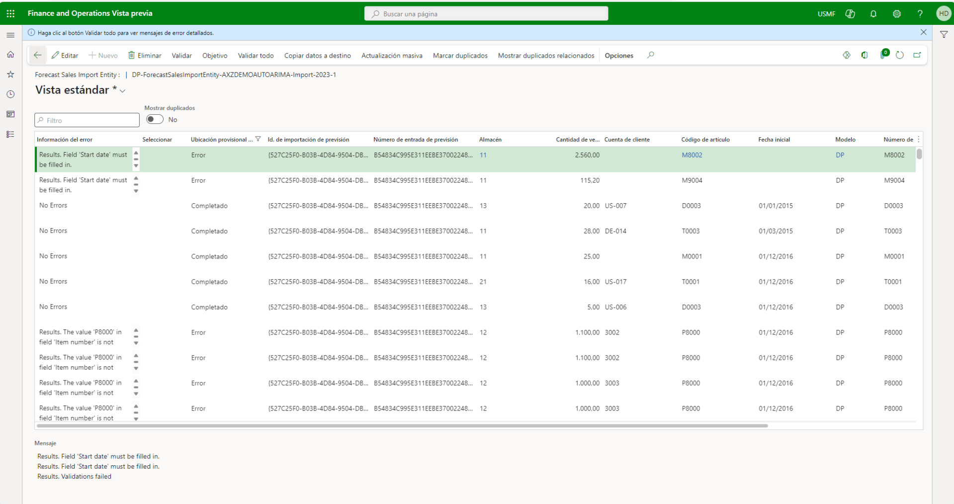 Como se ve en este caso, el error ha dado debido a un problema con la secuencia numérica, si necesitamos mas información y dado que utiliza la importación estándar de FO (DMF) podremos ver el resultado en nuestra área de trabajo de importación de datos: