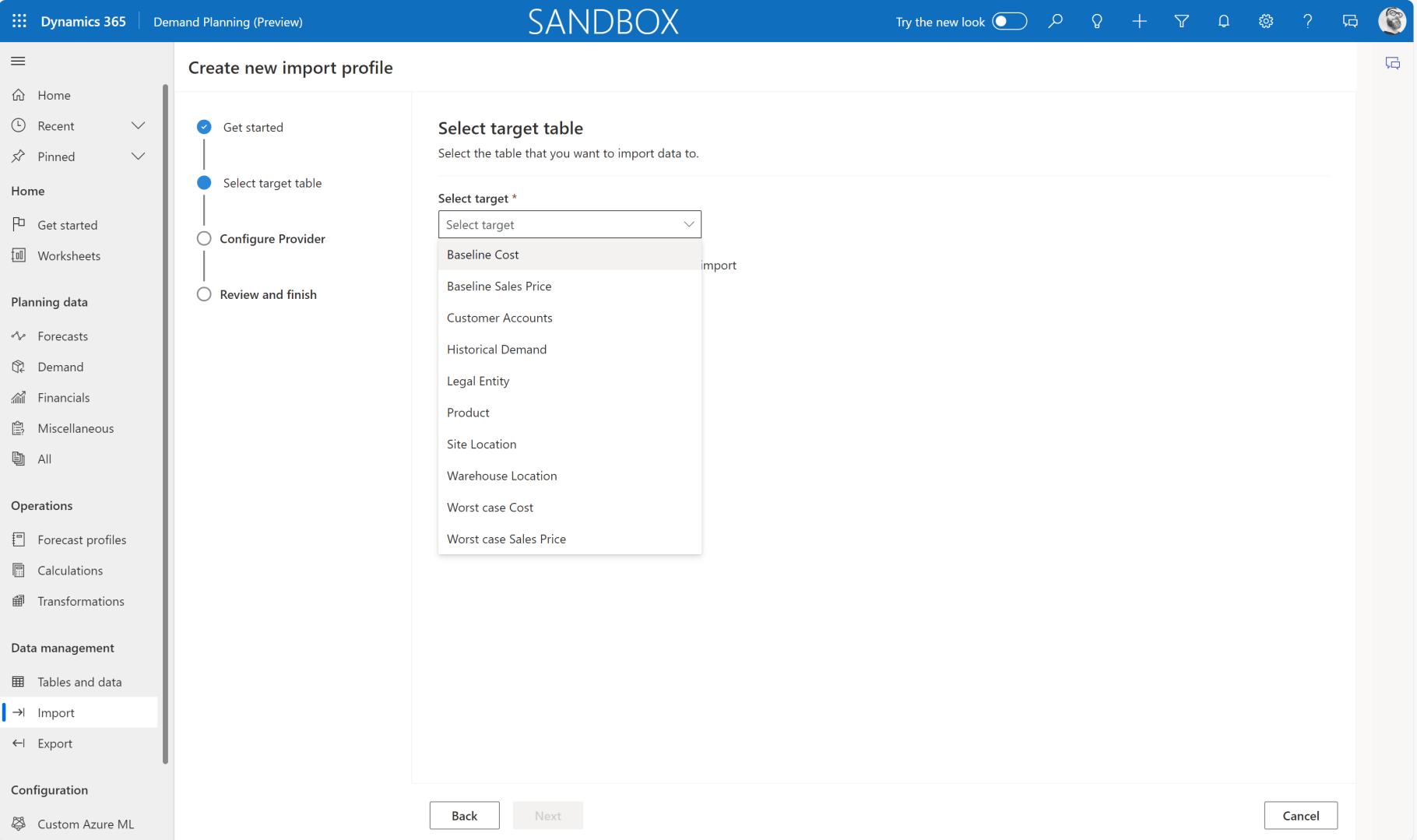 Vamos a revisar todos sus componentes y lo sencillo que es configurarlo de forma básica para que funcione con FO. Lo primero será instalar la solución en nuestro entorno de Dataverse. Aquí no importa que no sea el mismo que el de FO ya que no sincroniza datos usando DW o Entidades virtuales. La guía para su instalación está aquí: Instalar, habilitar y configurar la aplicación de planificación de la demanda (versión preliminar) – Supply Chain Management | Dynamics 365 | Microsoft Learn