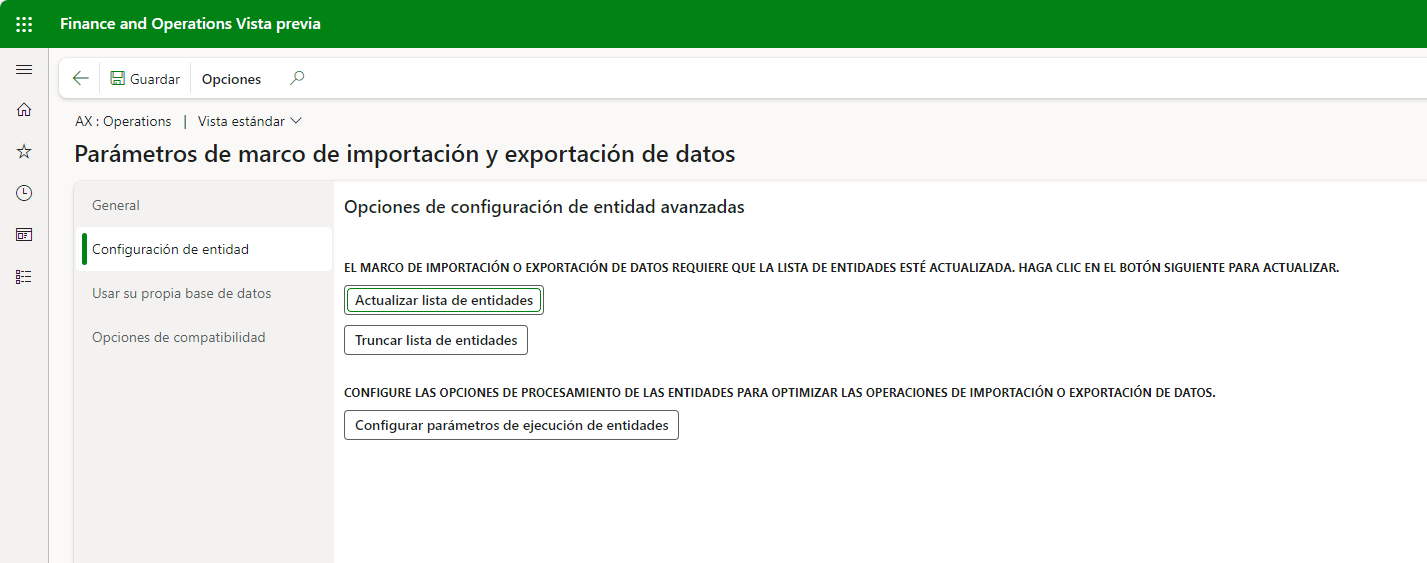Lo primero que haremos es seleccionar la entidad de destino, como se puede apreciar tenemos varias entidades disponibles, la importación de FO estándar rellenará la mayoría de ellas, pero aquellas relacionadas con precios tendremos que rellenarlas nosotros por nuestra cuenta si queremos usarlas.
