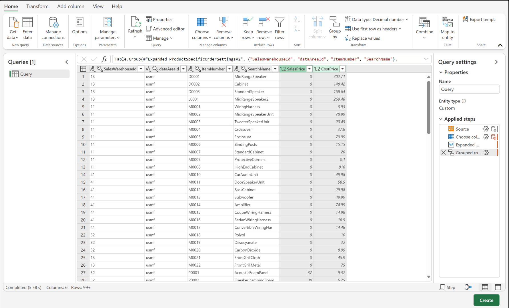 En este caso tenemos valores duplicados y la entidad que usamos nos nos vale para este fin, así que toca corregirlo o si no tenemos una entidad que nos devuelva el precio por almacén y entidad legal como es nuestro caso, siempre podemos hacernos una PowerQuery tirando de Odata: