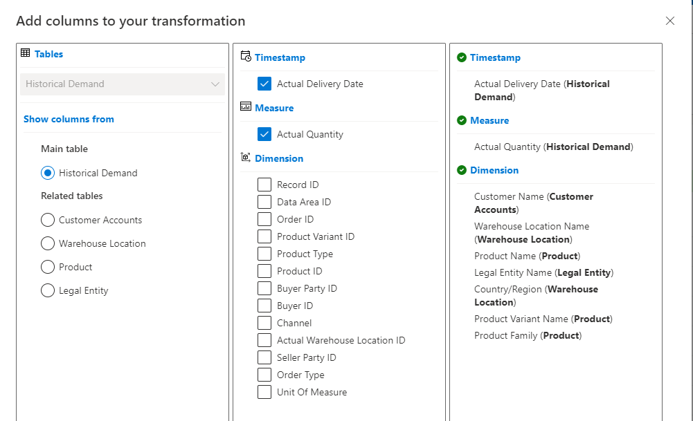 Es importante comentar en este punto, que si queremos exportar los datos luego a FO necesitaremos como dimensiones los ID de los campos clave: Producto, Variante, Almacén, Cliente, etc. Si no los añadimos ahora, luego podremos hacerlo pero necesitaremos ejecutar de nuevo todos los modelos que se creen a partir de esta transformación.