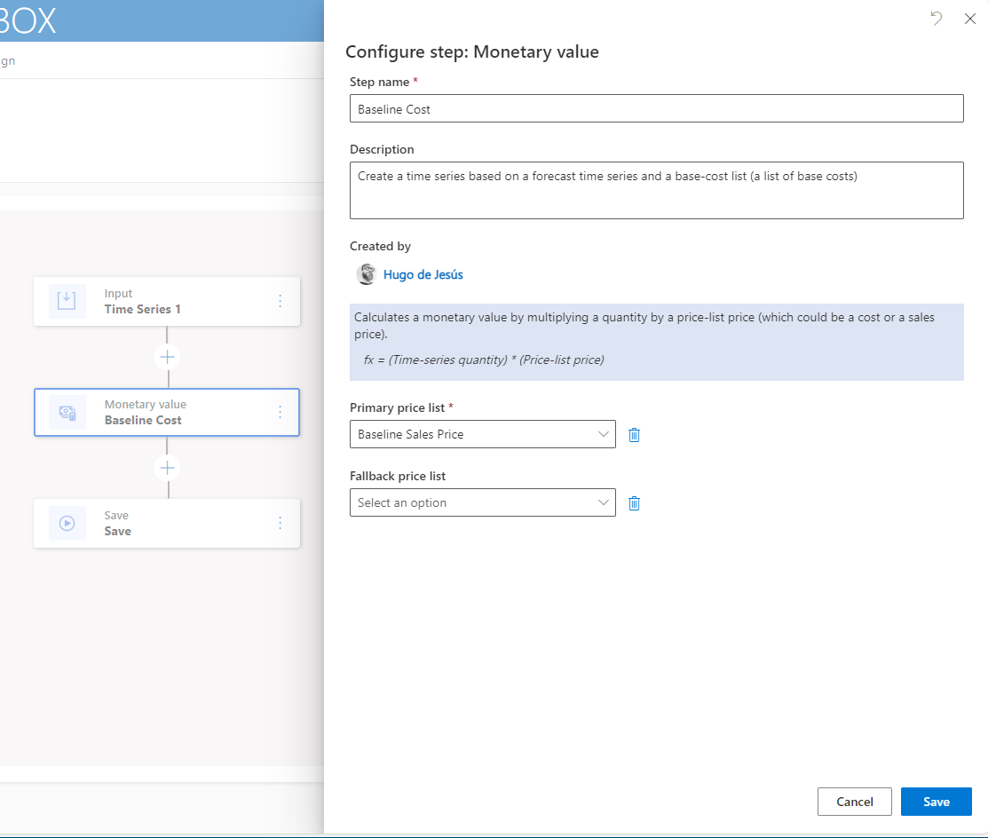 Habría que añadir que antes de crear los forecast y después de generar las transformaciones, hay que crear los cálculos, por ejemplo, si queremos no solo calcular cantidades, si no también importes, tendremos que añadir el precio de coste y el pvp del producto y crear el calculo de cantidad * precio.