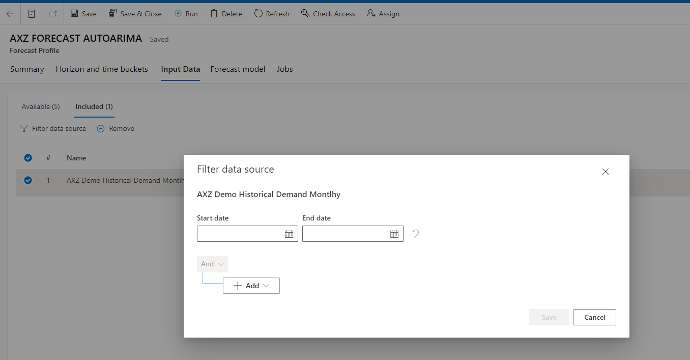 La siguiente opción es usar el AML de FO, esto es necesario si hemos estado usando la funcionalidad anterior de Demand Forecasting en FO y queremos seguir usando el mismo modelo. Los parámetros que aparecen son los que se configuran directamente en la solución antigua de FO: