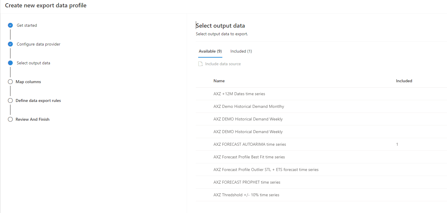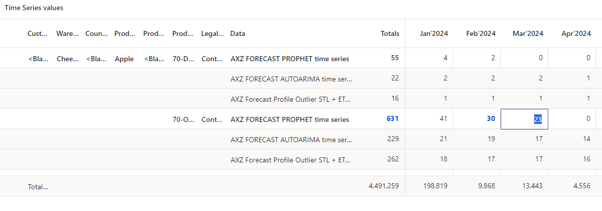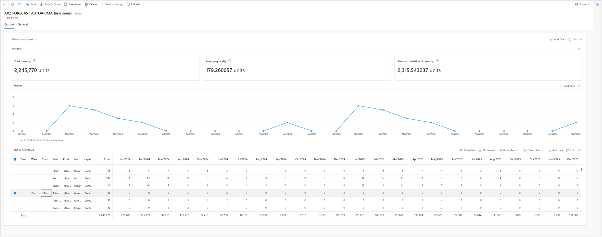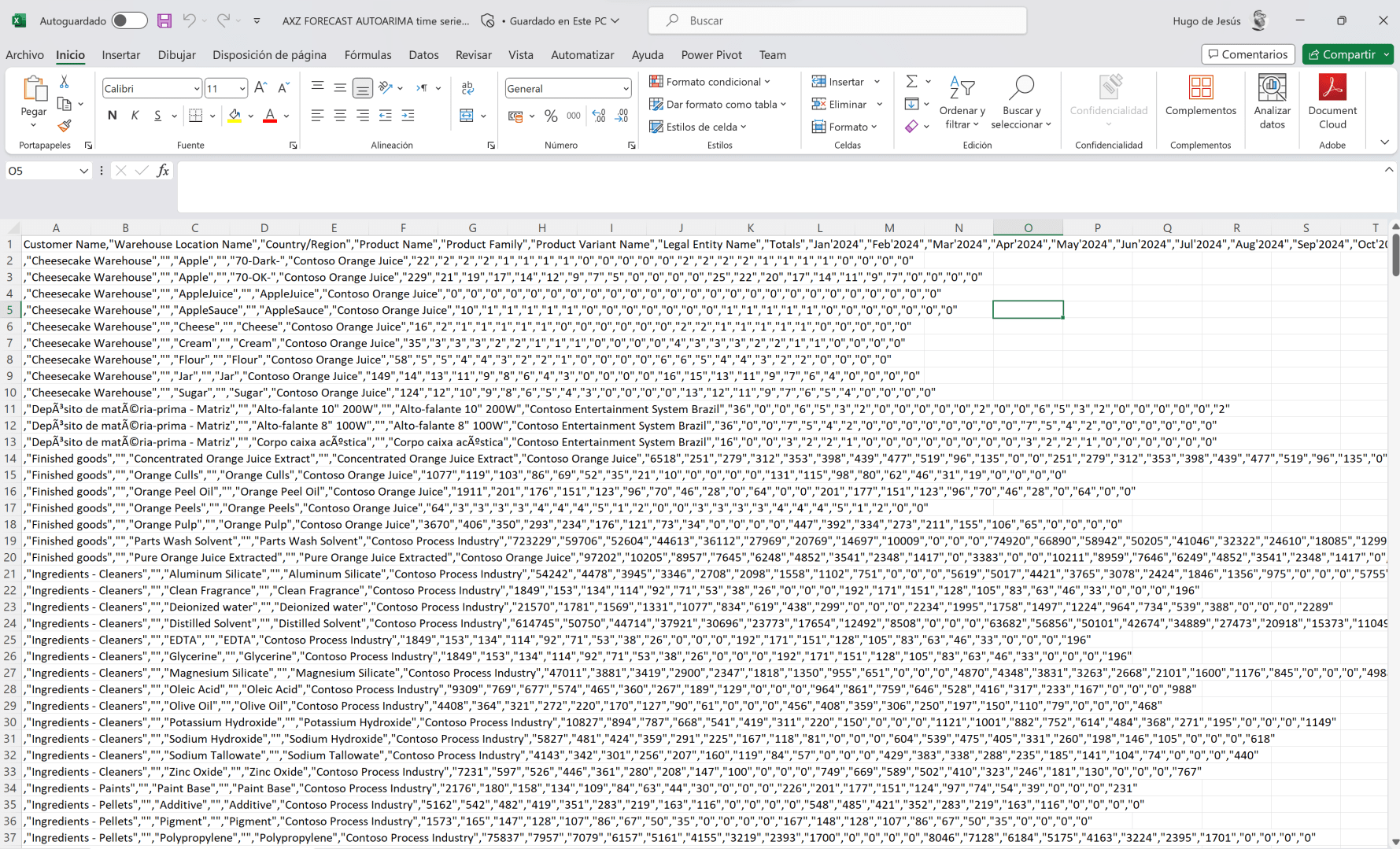Terminado de revisar los modelos, lo último que haremos es exportar los datos, esta vez la única opción es a FO, pero en realidad nada nos impediría exportarlos a SAP, BC o a cualquier otro sistema, solo que en este caso tendremos que ir a la serie temporal y exportarlo como CSV, obteniendo un fichero como este: